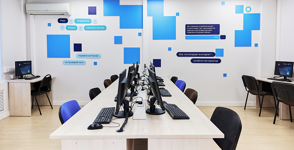 Аудитория рассчитана на 15 рабочих мест и оснащена современным оборудованием. Команда R-Vision разработала концепцию оформления и провела ремонтные работы, сформировав полноценное пространство для учебной и проектной деятельности.